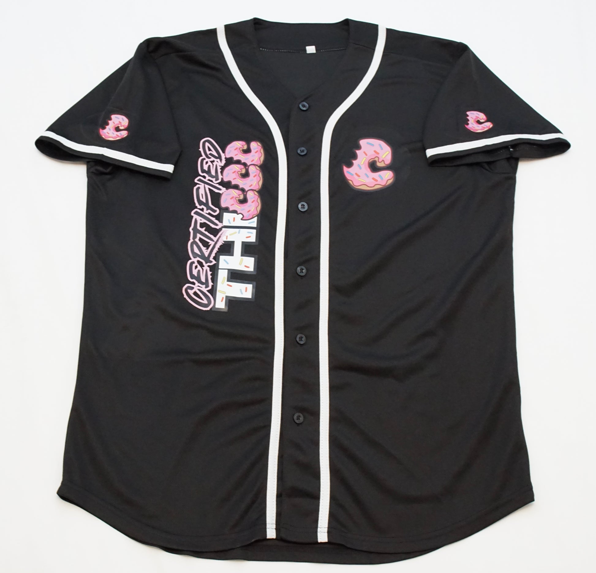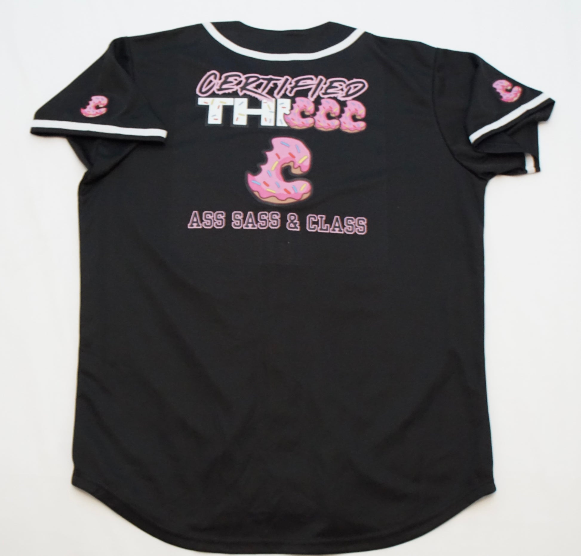 Our Certified Thiccc Jersey is composed of polyester fabric for performance, comfort and breathability. This baseball style jersey features our iconic Certified Thiccc logo on the left chest, donut on the right chest, donut embroidery patches on the sleeves and large size logo on the backside.