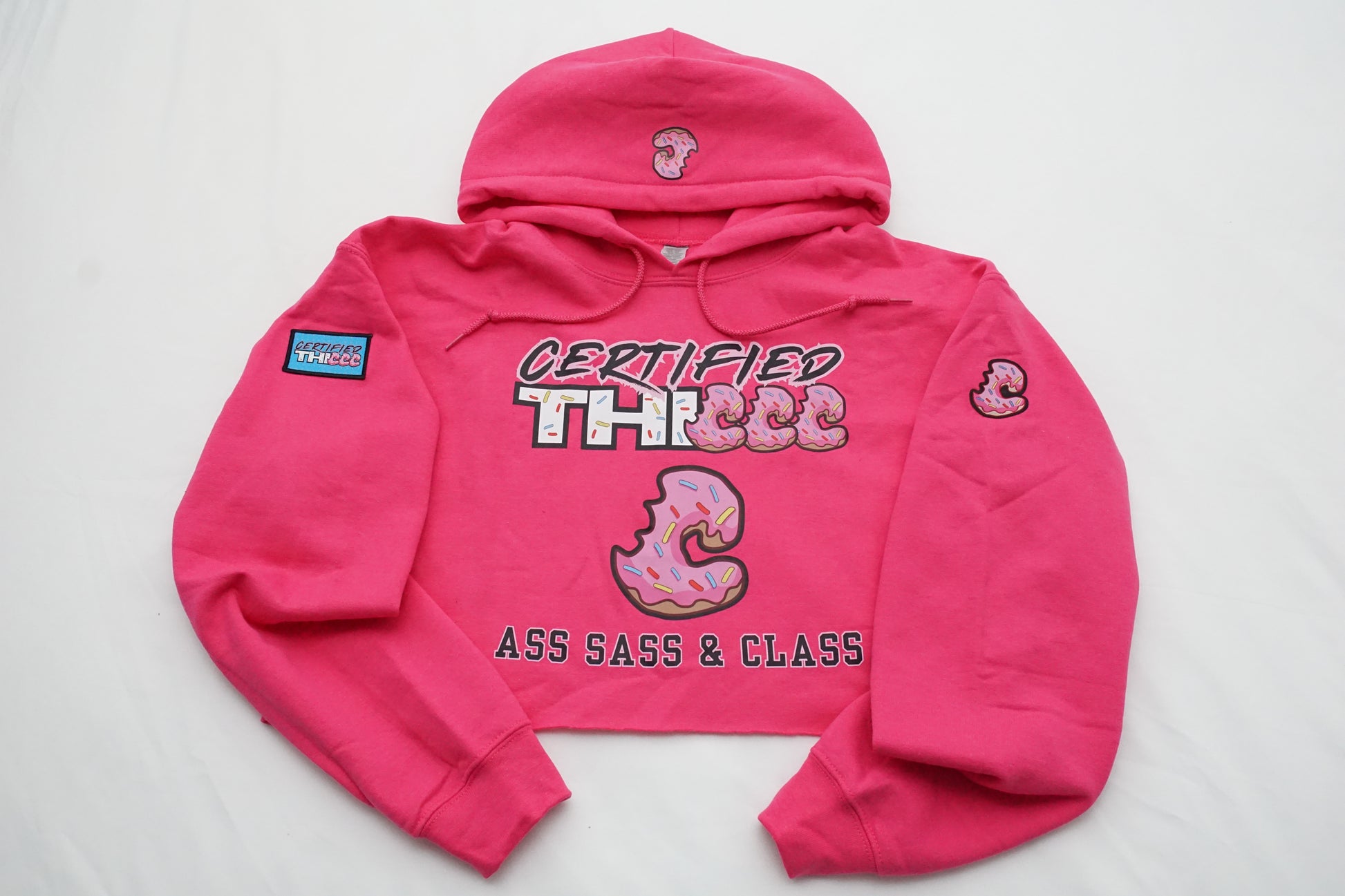 Certified Thiccc flare with our 13oz cotton/poly blend crop hoodie featuring our signature full front Certified Thiccc front logo, iconic donut "C" logo on the hood and left and right arm patches to show your Thiccc from all angles.
