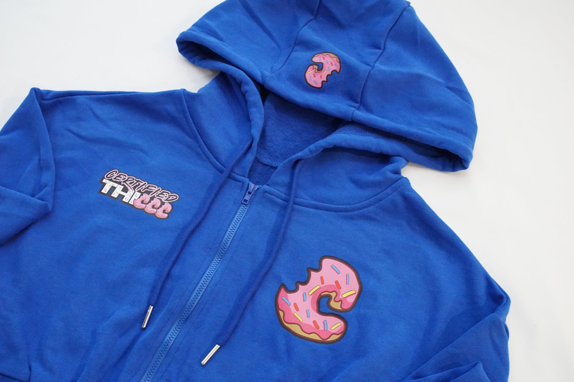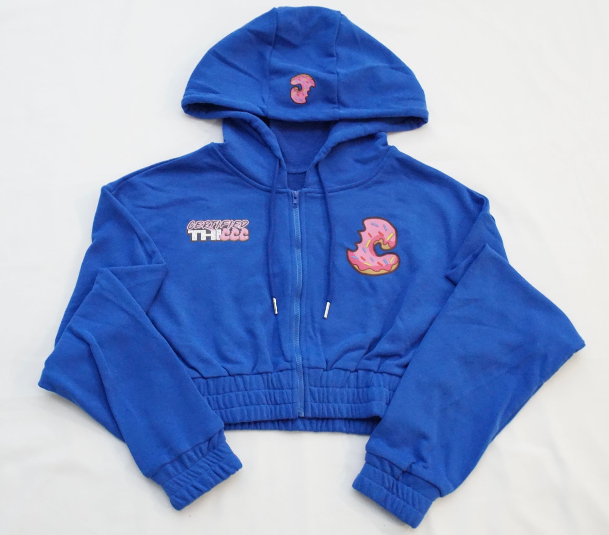 Our Certified Thiccc Crop Hoodie is composed of a heavy blend 16oz terry cotton/poly blend fabric for a heavy quality feel for comfort and warmth. Featuring our donut logo on the hood with front left and right chest logos as well. This crop hoodie features a full zipper, quality draw strings, elastic cuffs and waistband.
