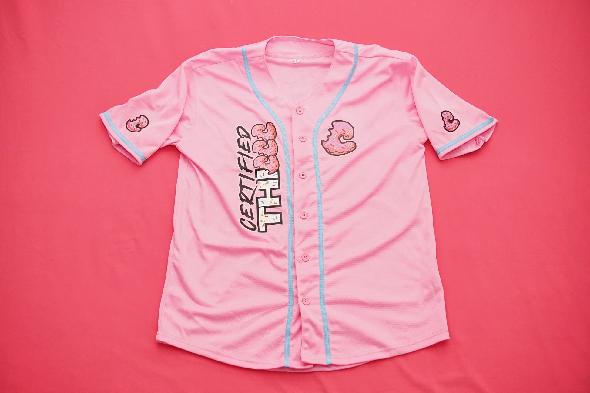 Our Certified Thiccc Jersey is composed of polyester fabric for performance, comfort and breathability. This baseball style jersey features our iconic Certified Thiccc logo on the left chest, donut on the right chest, donut embroidery patches on the sleeves and large size logo on the backside.