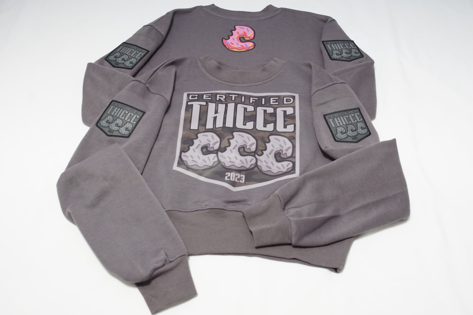 Make a statement with our Covert 10oz cotton/poly blend ultra soft crewneck crop sweatshirt featuring our Thiccc badge front logo, left and right sleeve embroidered patches and signature donut logo on the rear.