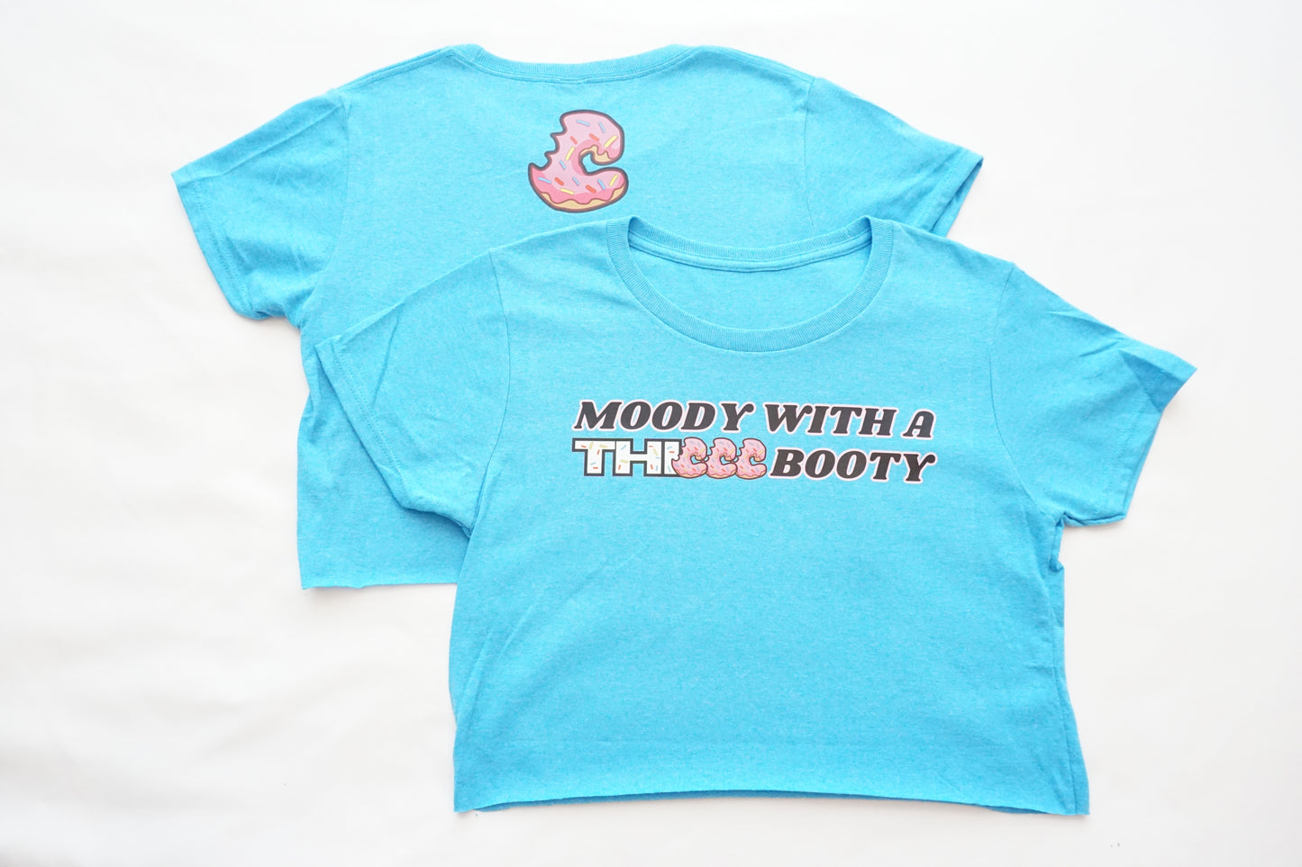 Show your Thiccc in our soft cotton/poly blend 9oz crop t-shirt featuring our iconic donut "C" logo on the back and our full front "Moody with a Thiccc booty" quote.