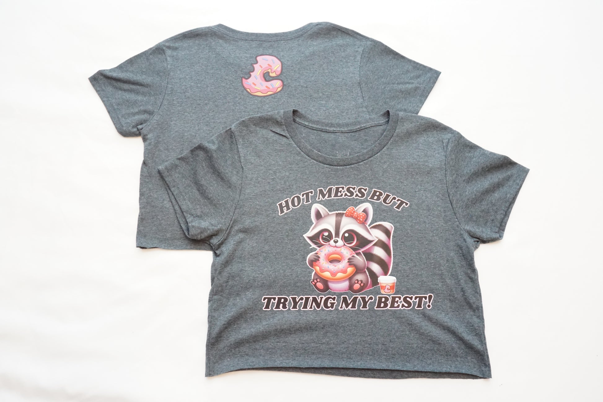 Show your Thiccc in our soft cotton/poly blend 9oz crop t-shirt featuring our iconic donut "C" logo on the back and our full front cute Hot Mess Racoon on the front.