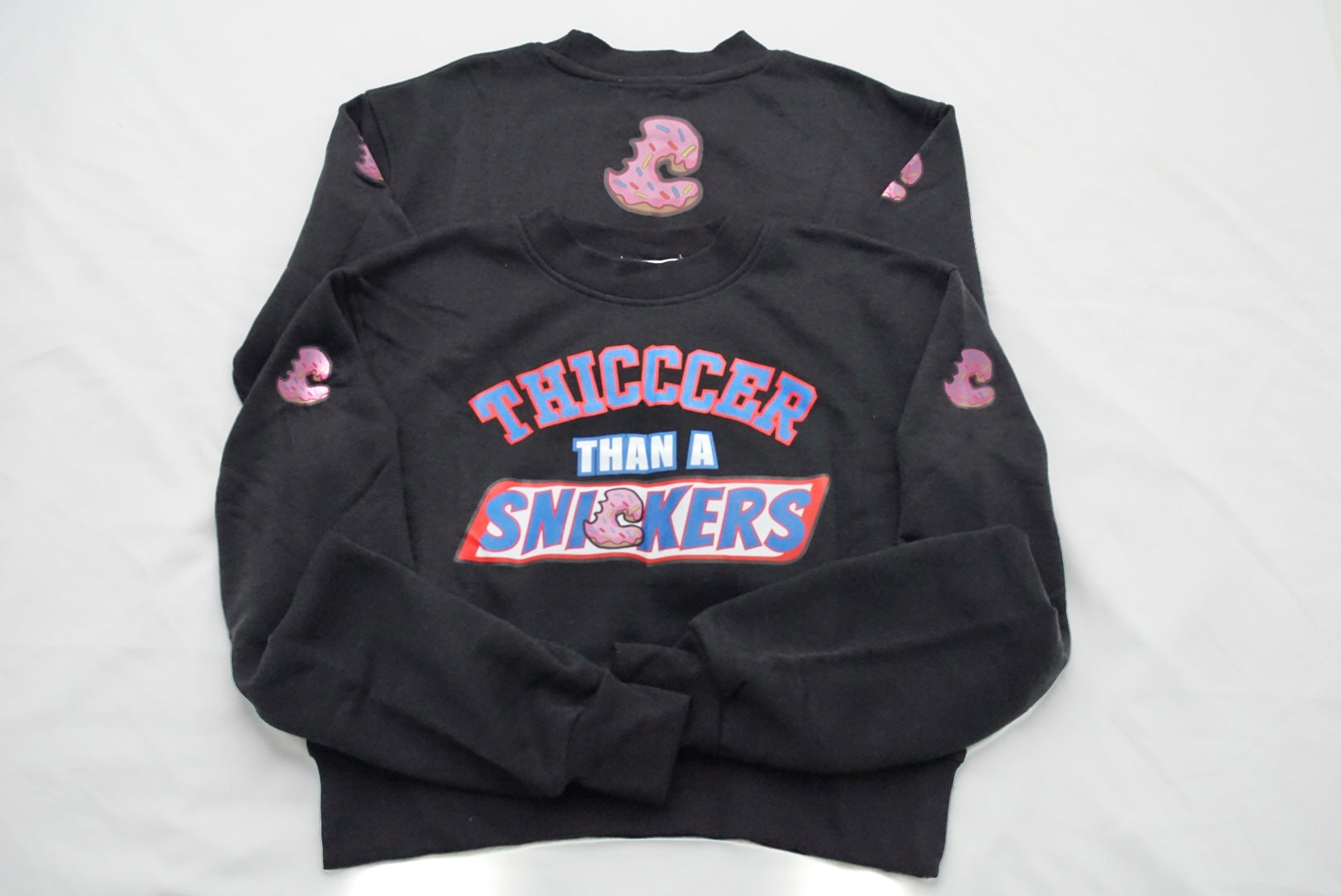 Show your Thiccc with this 10oz ultra soft cotton/poly blend fleece crop crew neck sweatshirt with our super fun Thicccer than a Snickers theme logo.