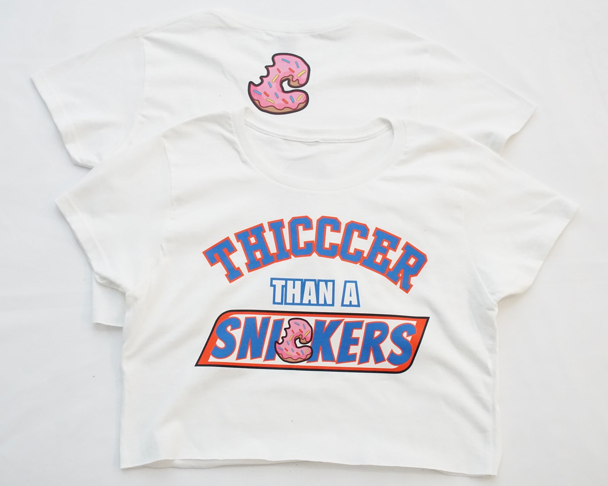 Let them know you're Thicccer than a Snickers in our soft cotton/poly blend 9oz crop t-shirt. Featuring our iconic donut "C" logo on the back and full front Thicccer than a Snickers logo on the front.