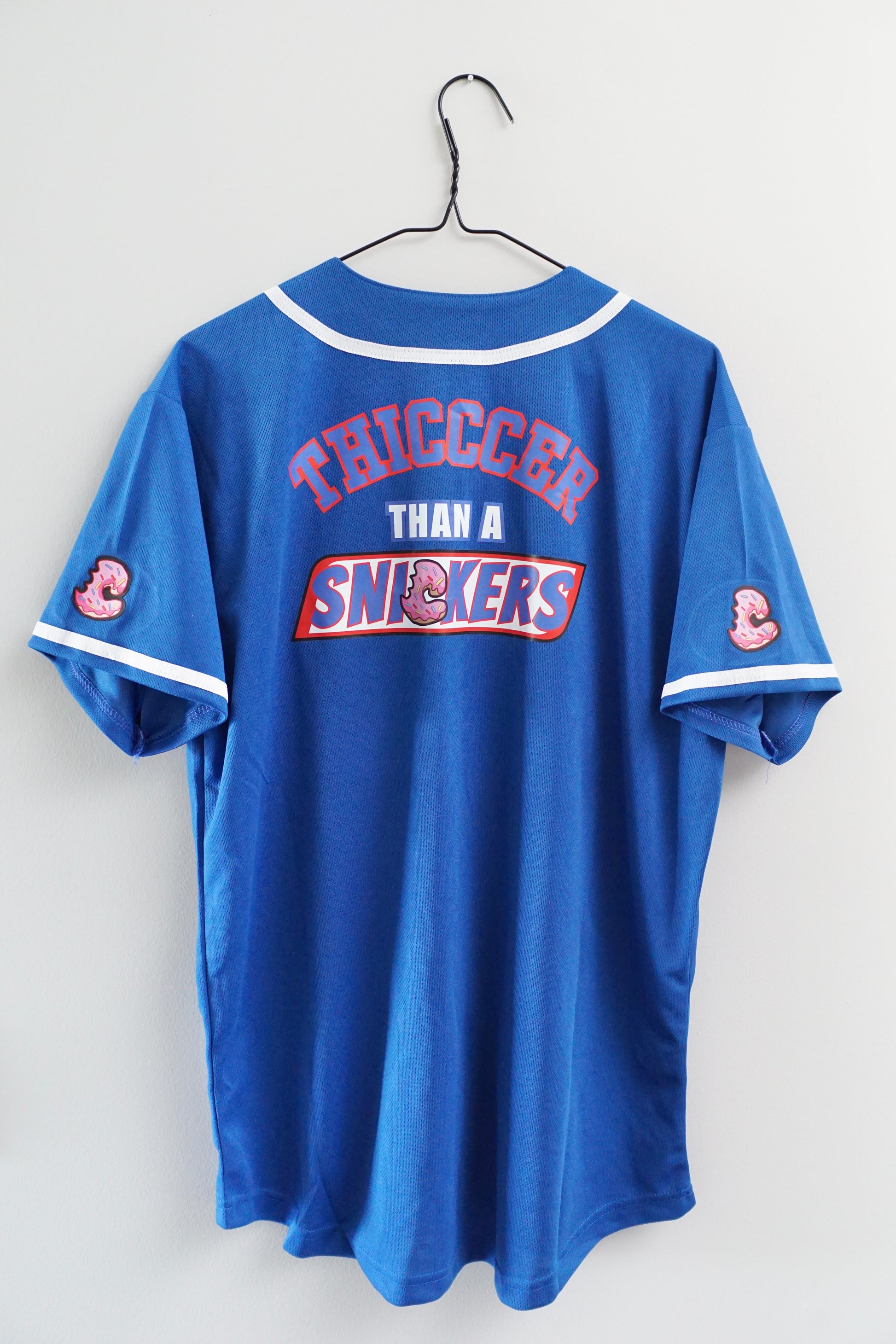 Our Thicccer than a Snickers Jersey is composed of polyester fabric for performance, comfort and breathability. This baseball style jersey features our iconic Certified Thiccc logo on the right chest, donut on the left chest, donut embroidery patches on the sleeves and large size logo on the backside.