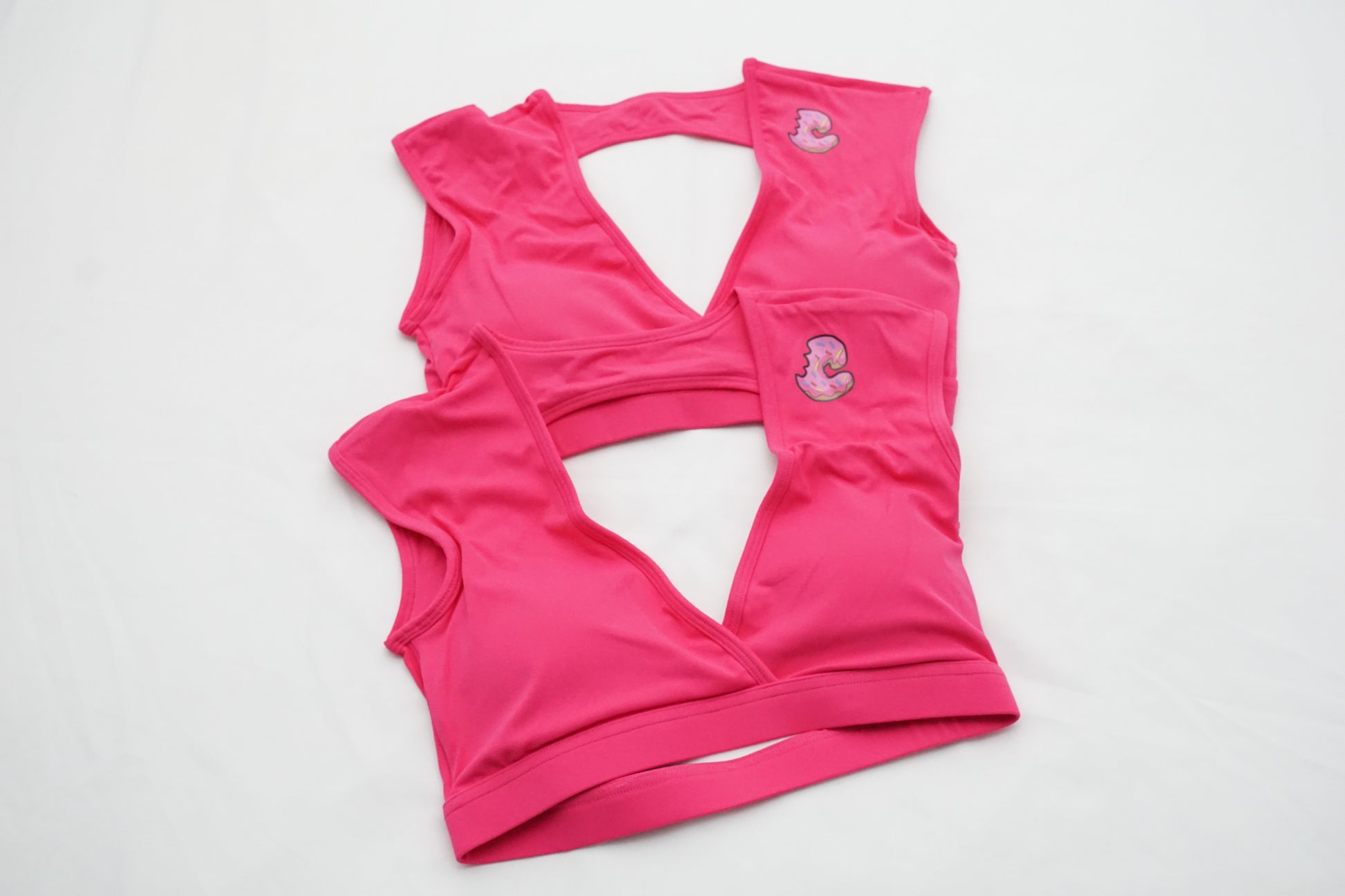 Our V-Cut Open Back soft Nylon/Lycra blend Sports Bra for a Thiccc vibe designed for performance and appeal featuring our iconic logo on the left shoulder.